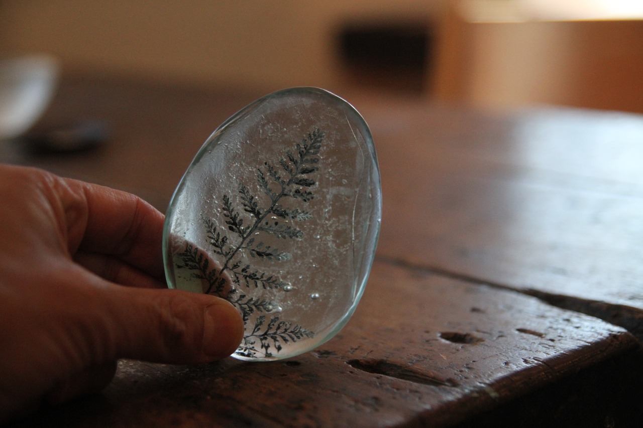 こちらはガラスの石「シダ」。ぼんやり眺めていると不思議に気持ちが落ち着く、他にない作品です。
