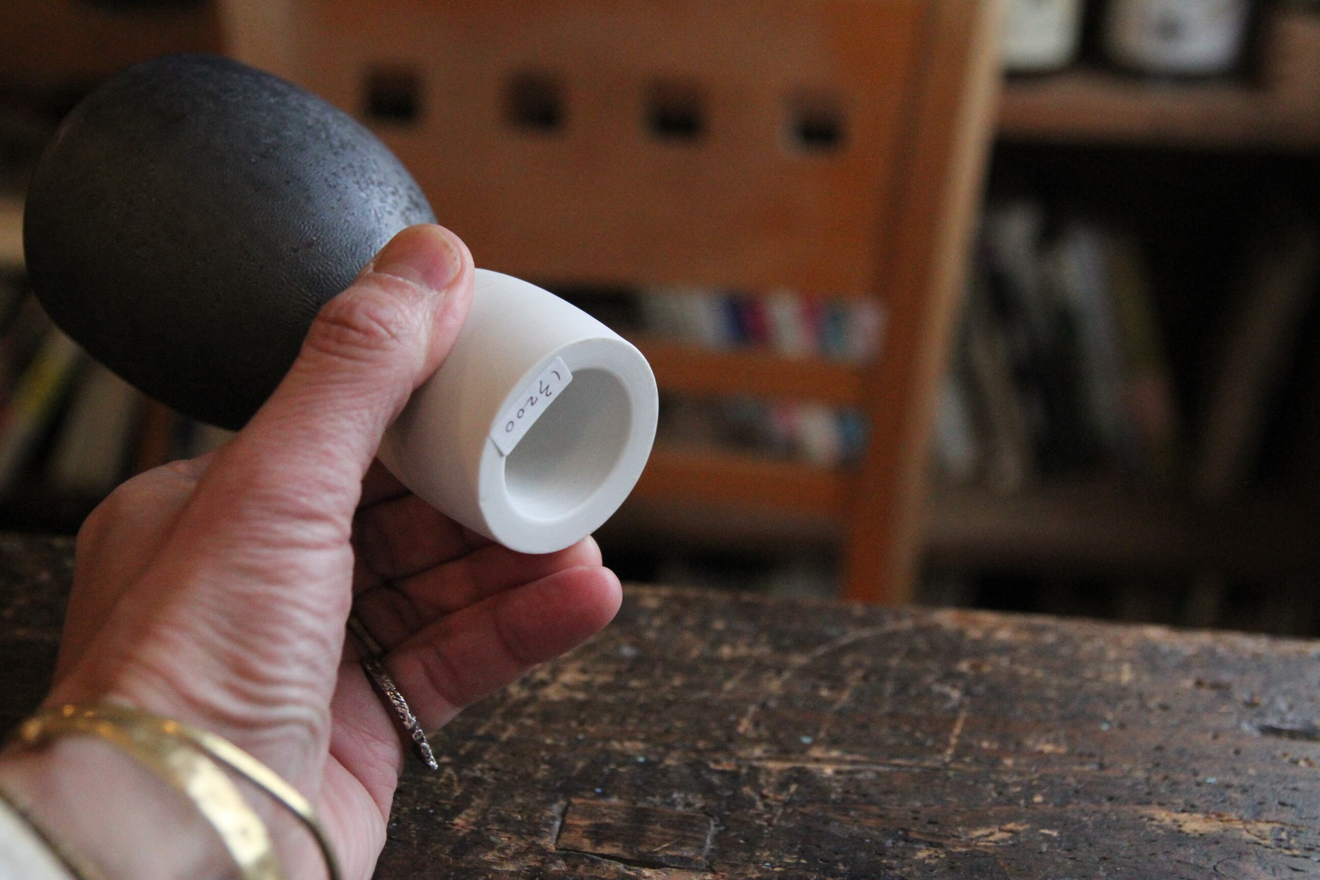 天草の陶石を用いた磁器作品、ロクロで描かれる滑らかで美しい曲線、口当たりや手触りの良いその風合い。なかでも黒は鉄分を多く含んだ釉薬、赤はそこに漆、金はそこに真鍮を上絵して焼いています。裏面も銀で装飾してあるこだわり。