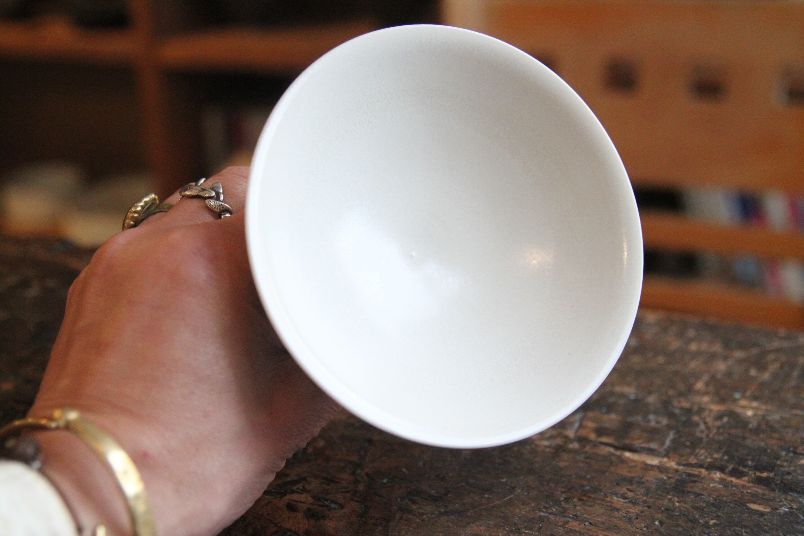 天草の陶石を用いた磁器作品、ロクロで描かれる滑らかで美しい曲線、口当たりや手触りの良いその風合い。なかでも黒は鉄分を多く含んだ釉薬、赤はそこに漆、金はそこに真鍮を上絵して焼いています。裏面も銀で装飾してあるこだわり。