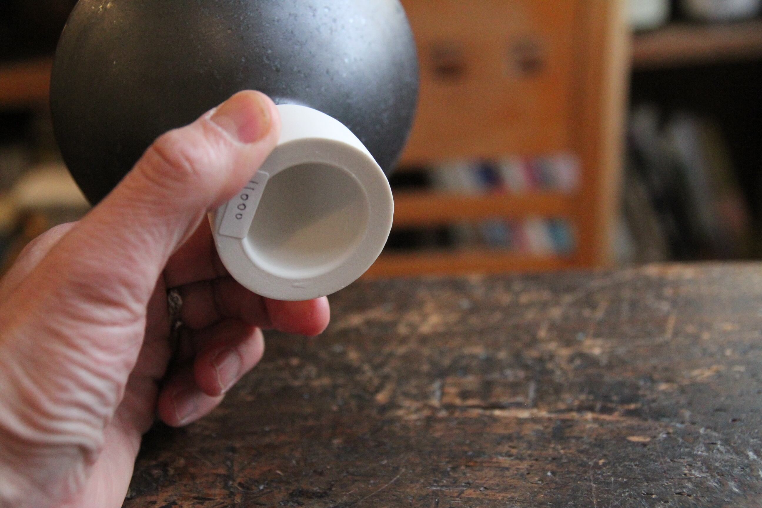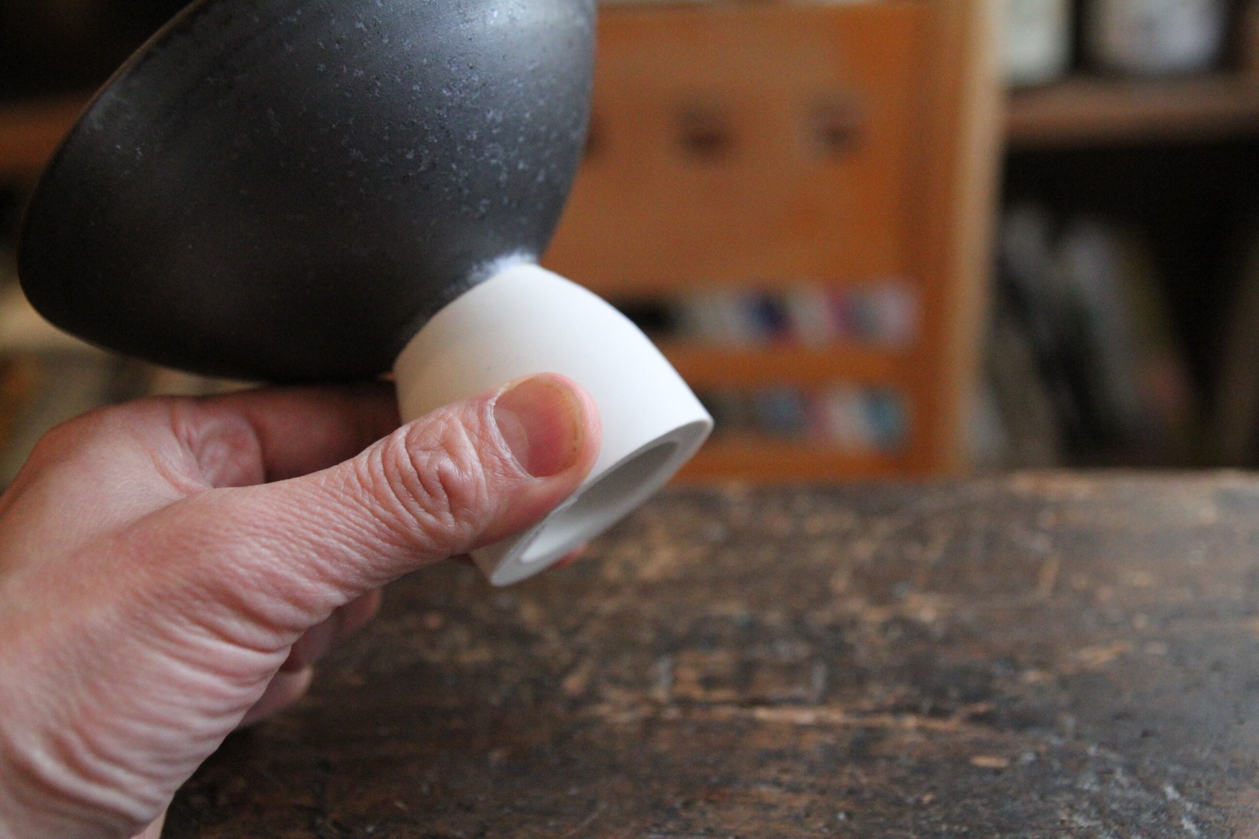 天草の陶石を用いた磁器作品、ロクロで描かれる滑らかで美しい曲線、口当たりや手触りの良いその風合い。なかでも黒は鉄分を多く含んだ釉薬、赤はそこに漆、金はそこに真鍮を上絵して焼いています。裏面も銀で装飾してあるこだわり。