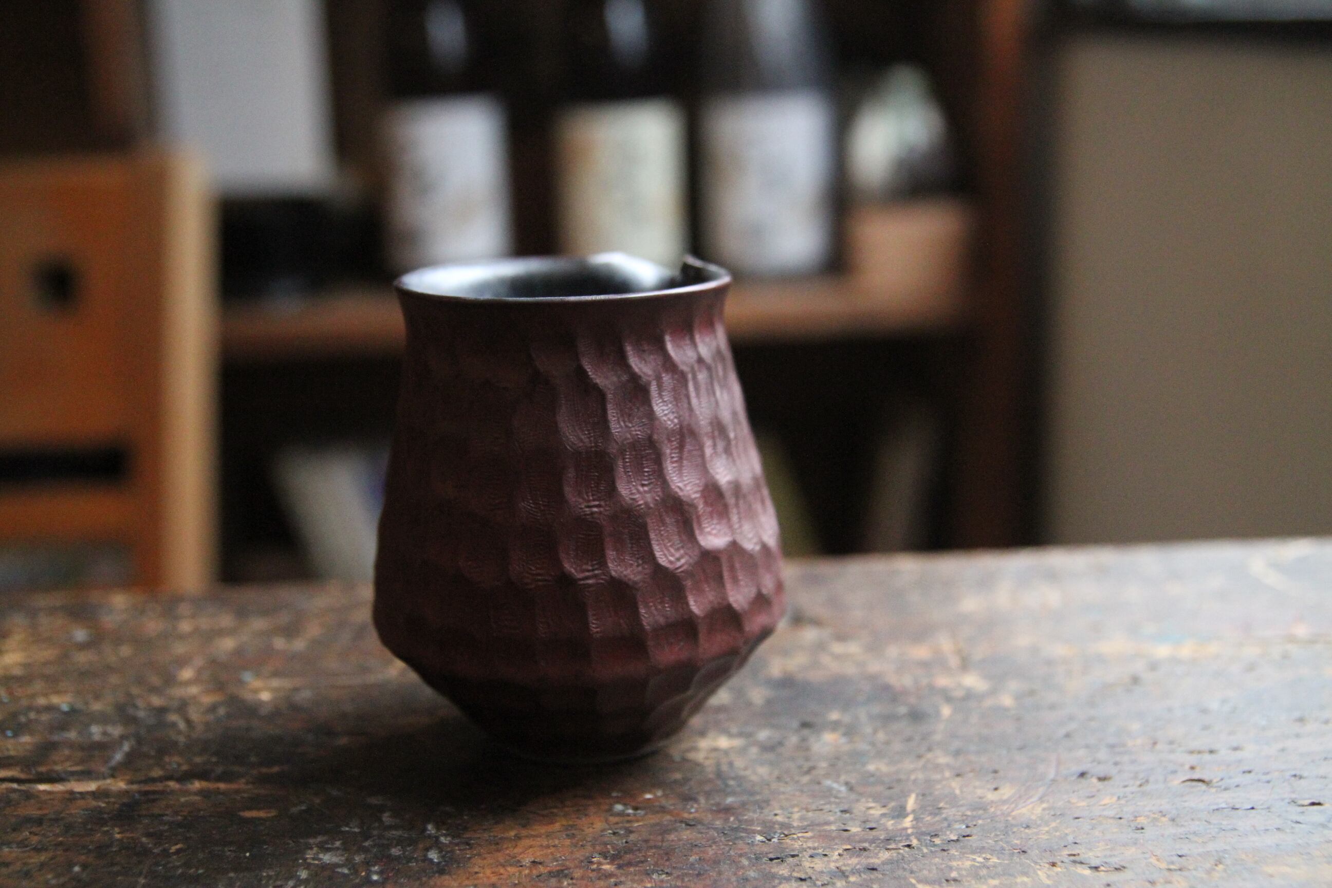 天草の陶石を用いた磁器作品、ロクロで描かれる滑らかで美しい曲線、口当たりや手触りの良いその風合い。なかでも黒は鉄分を多く含んだ釉薬、赤はそこに漆、金はそこに真鍮を上絵して焼いています。裏面も銀で装飾してあるこだわり。