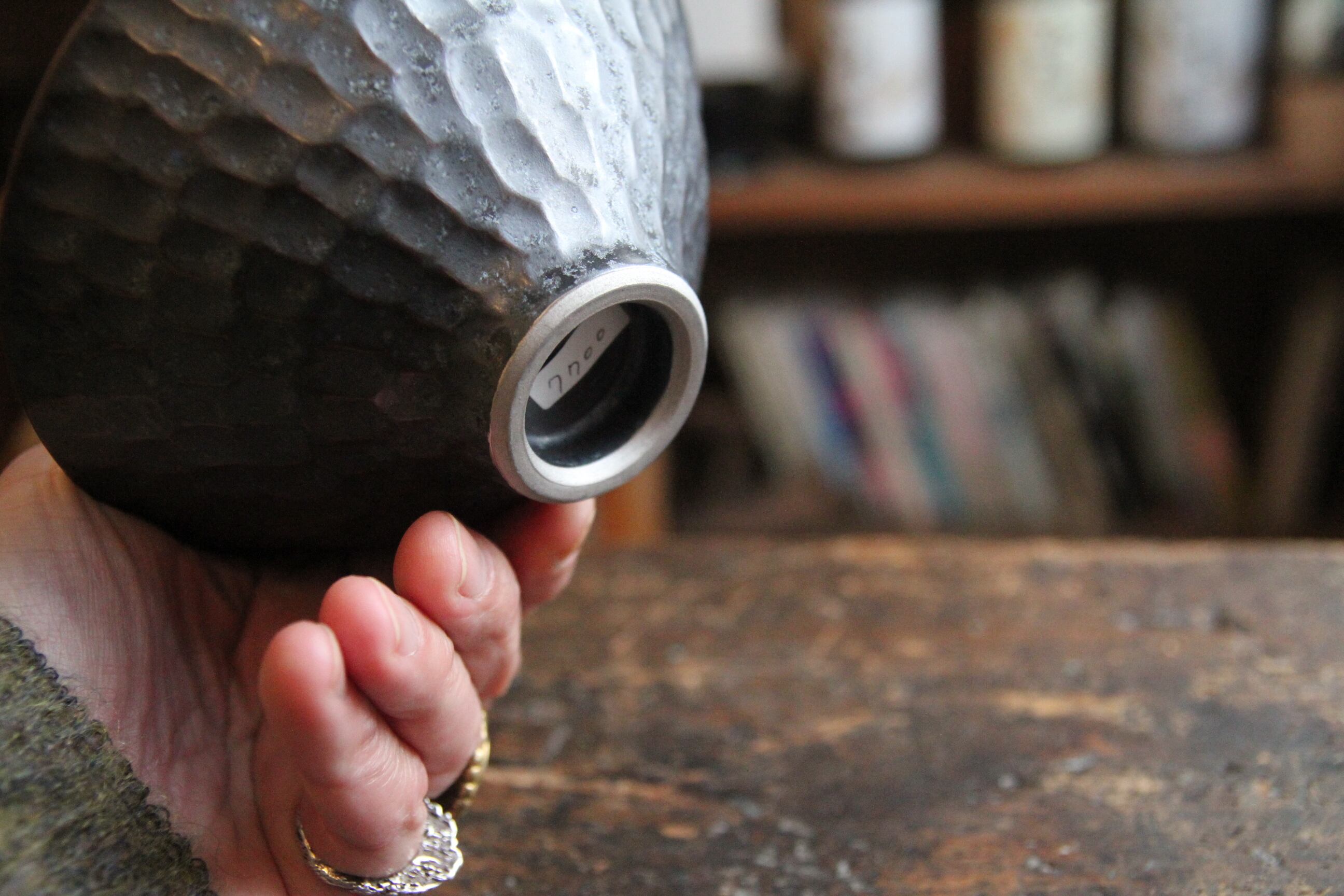 天草の陶石を用いた磁器作品、ロクロで描かれる滑らかで美しい曲線、口当たりや手触りの良いその風合い。なかでも黒は鉄分を多く含んだ釉薬、赤はそこに漆、金はそこに真鍮を上絵して焼いています。裏面も銀で装飾してあるこだわり。