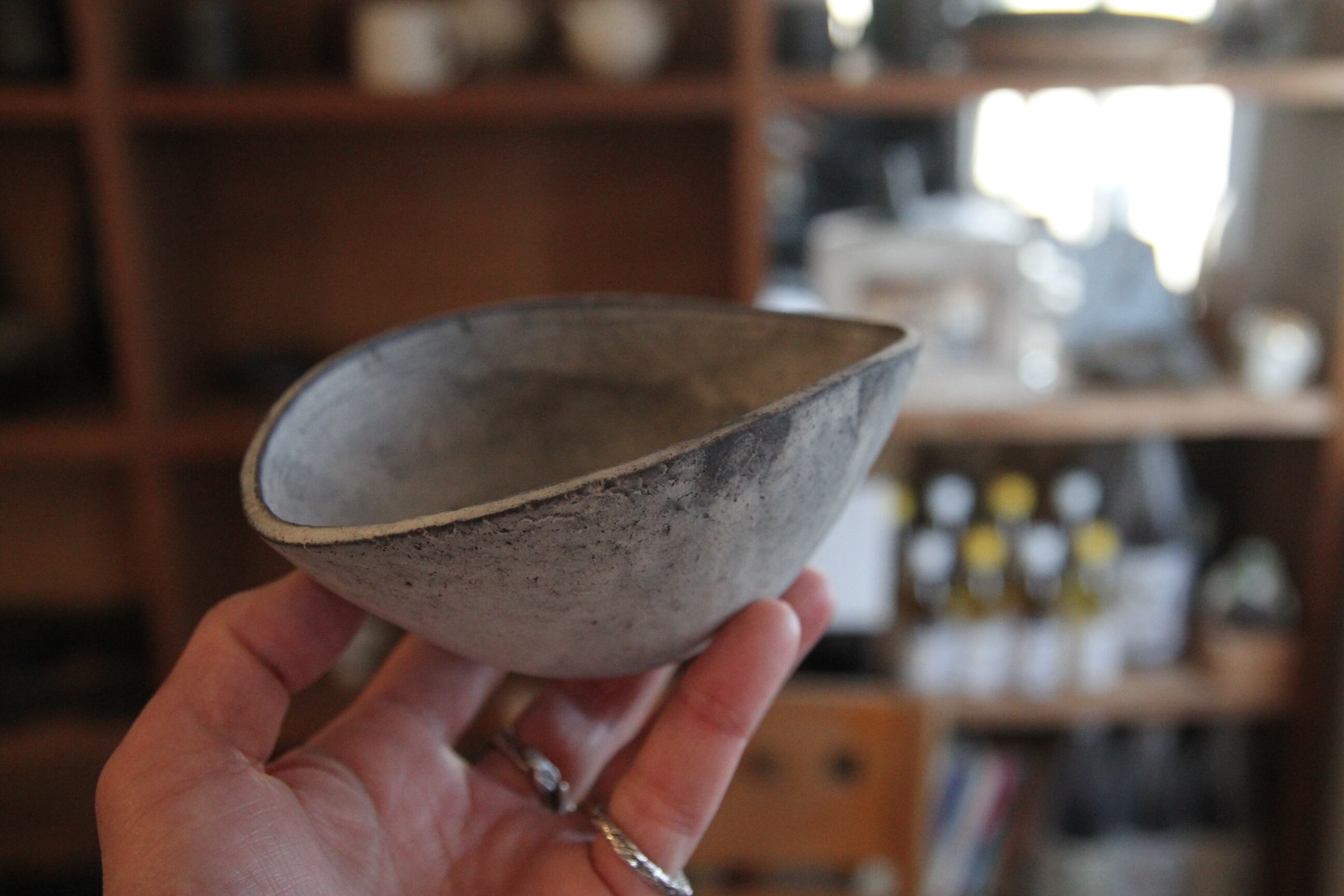 成形したあと、敢えて一度水に浸して独特の表情を出す、ちょっと他に見ない技法を用いた器。あくまで淡い凹凸を描くライン、時にまるで錆びついた風化のような表情、プライマルでありながらトライバルをも感じさせ、そしてそこはかとなくブルージー。虜になってしまう器。使うたびにしっとりした肌合いに。経年変化を愉しんでくださいませ。
