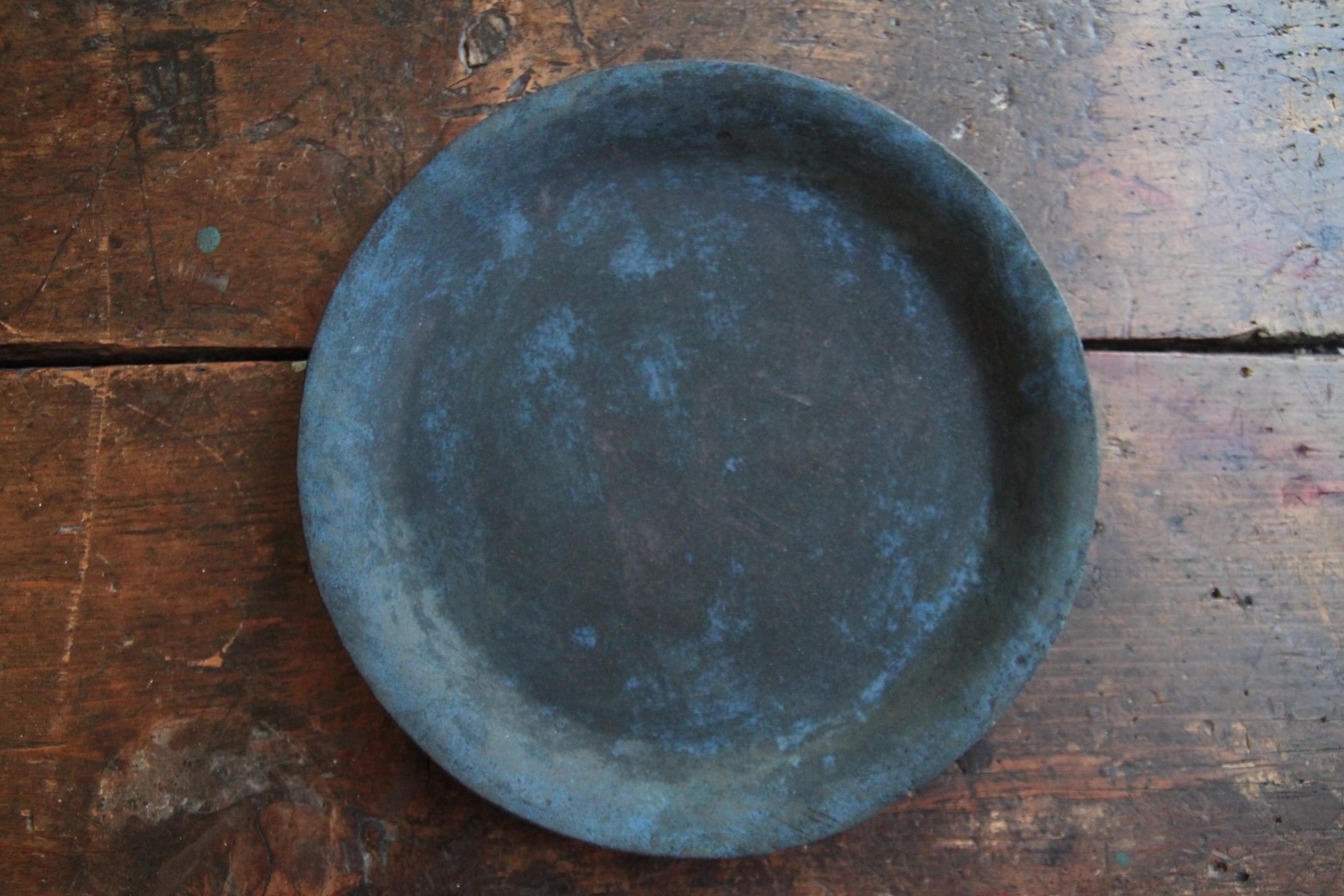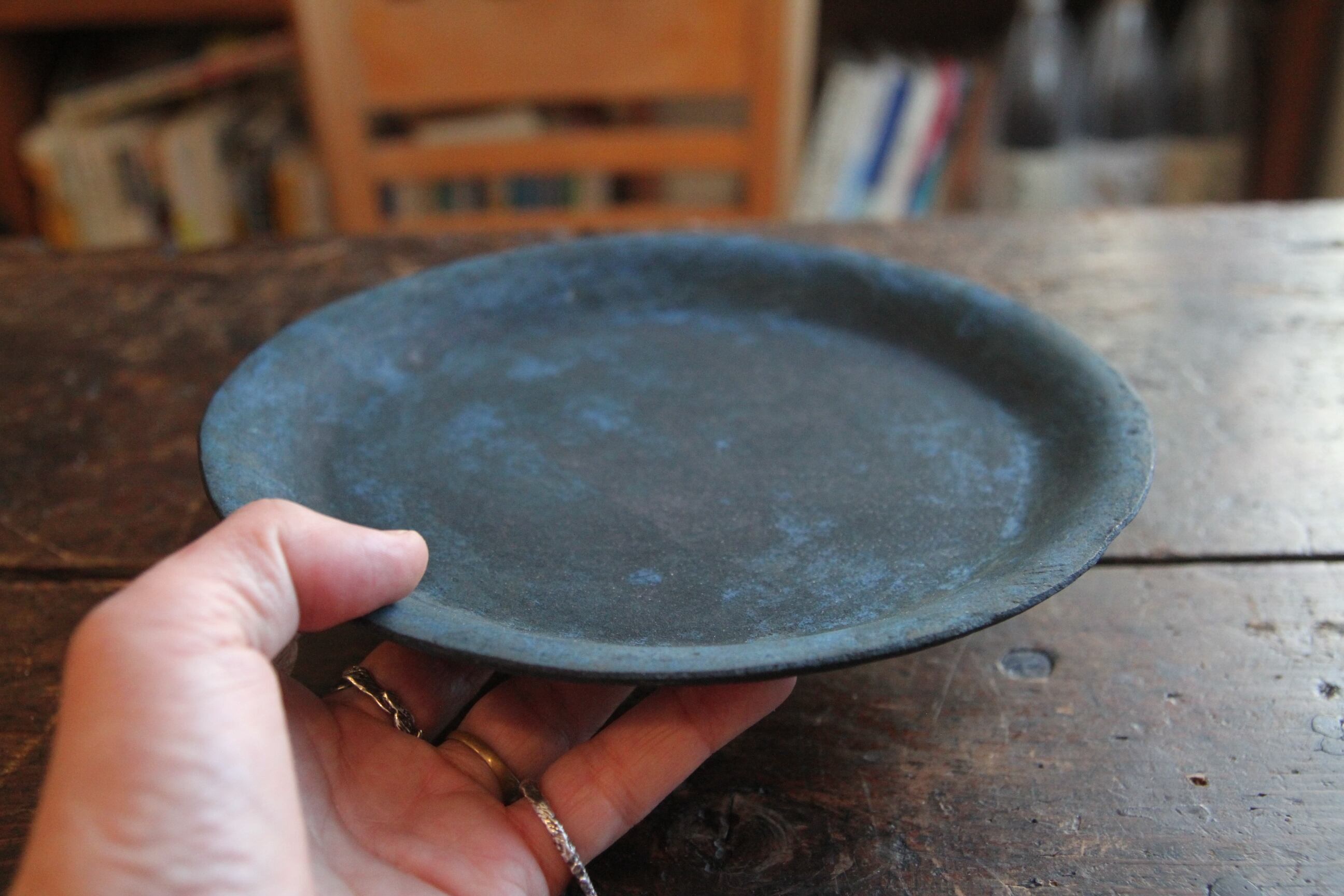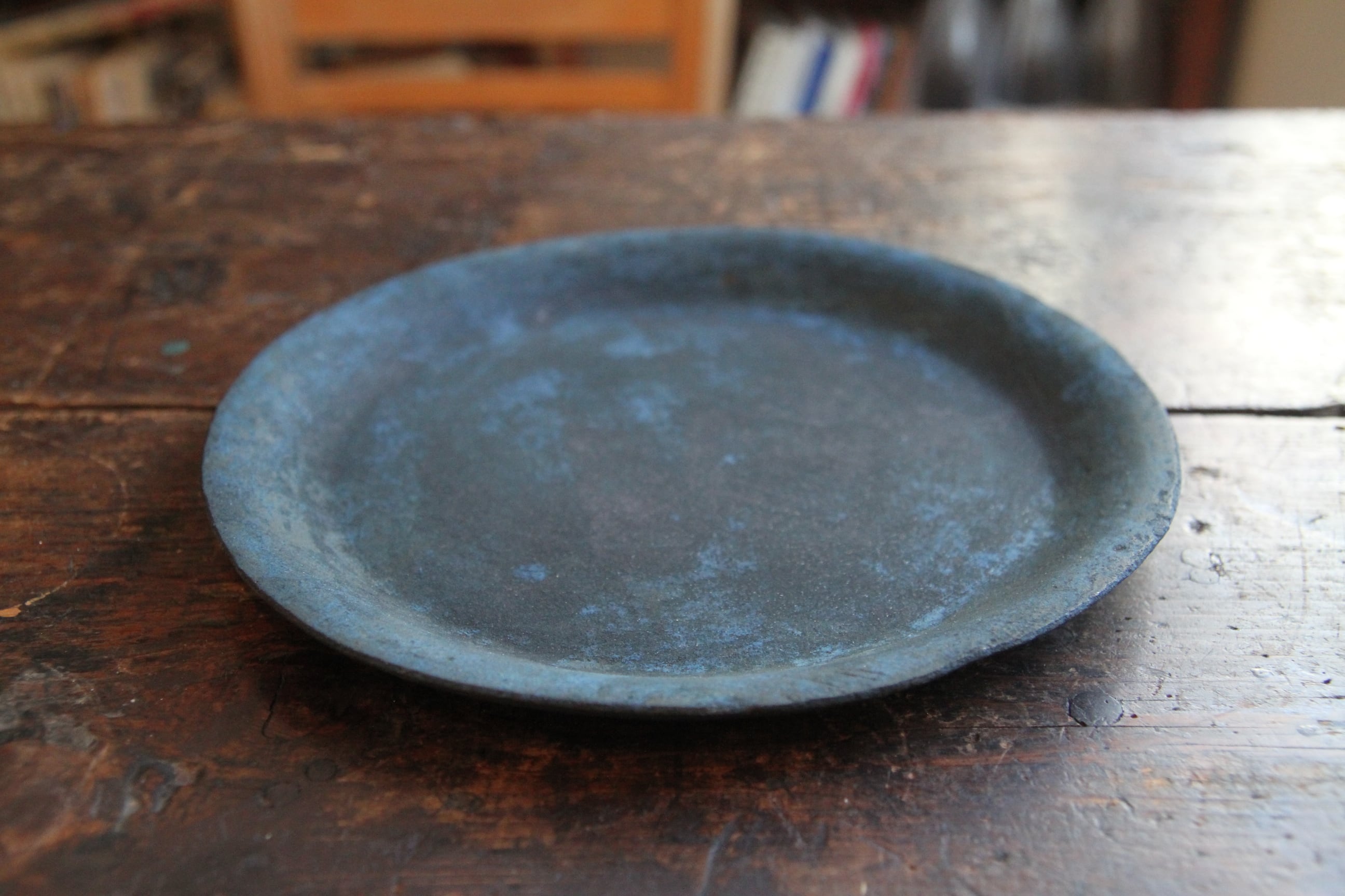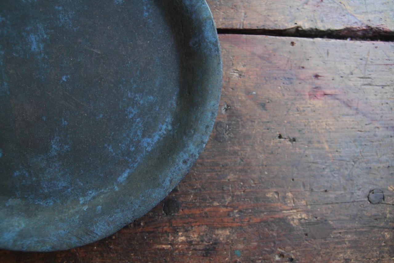 成形したあと、敢えて一度水に浸して独特の表情を出す、ちょっと他に見ない技法を用いた器。あくまで淡い凹凸を描くライン、時にまるで錆びついた風化のような表情、プライマルでありながらトライバルをも感じさせ、そしてそこはかとなくブルージー。虜になってしまう器。使うたびにしっとりした肌合いに。経年変化を愉しんでくださいませ。