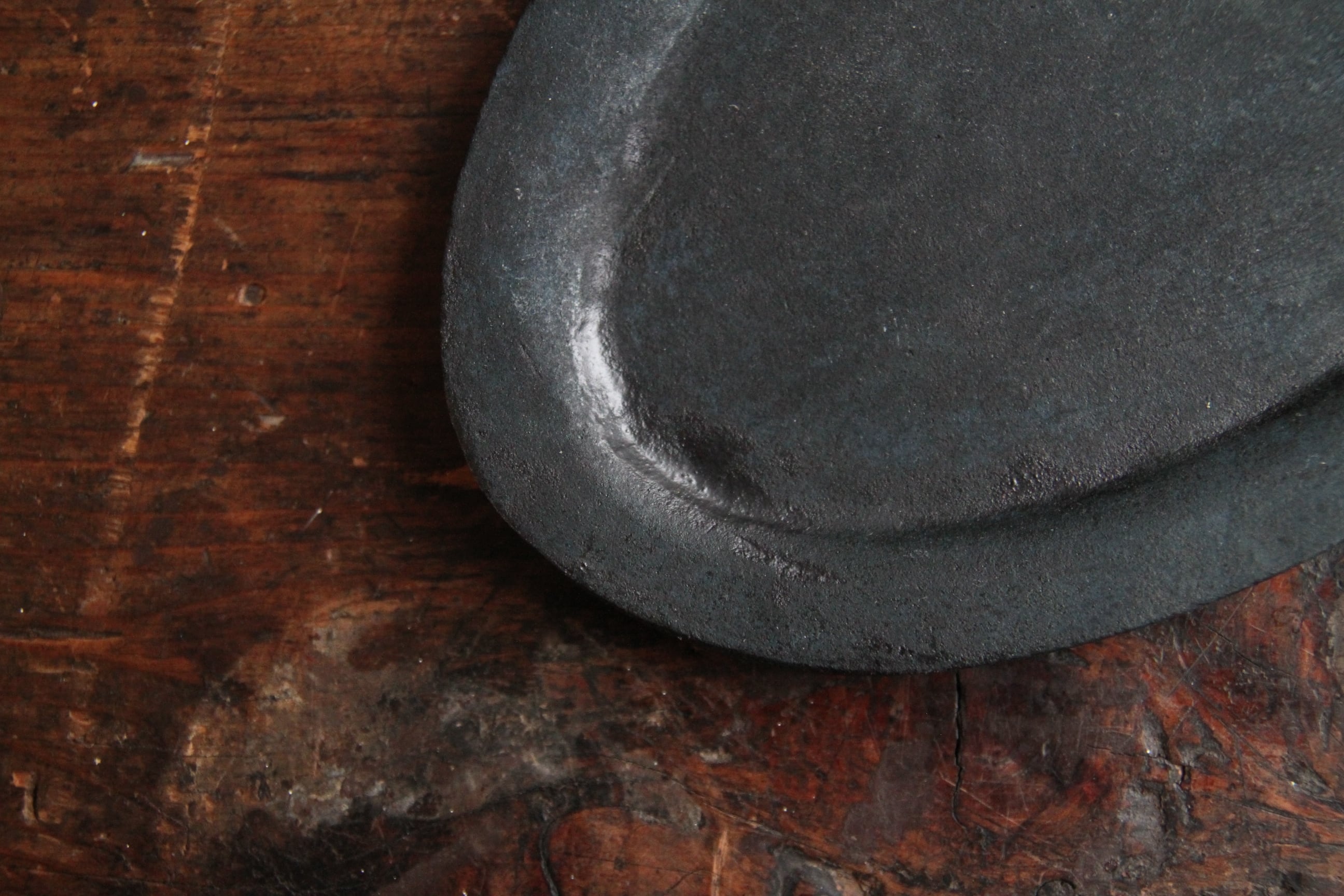 成形したあと、敢えて一度水に浸して独特の表情を出す、ちょっと他に見ない技法を用いた器。あくまで淡い凹凸を描くライン、時にまるで錆びついた風化のような表情、プライマルでありながらトライバルをも感じさせ、そしてそこはかとなくブルージー。虜になってしまう器。使うたびにしっとりした肌合いに。経年変化を愉しんでくださいませ。