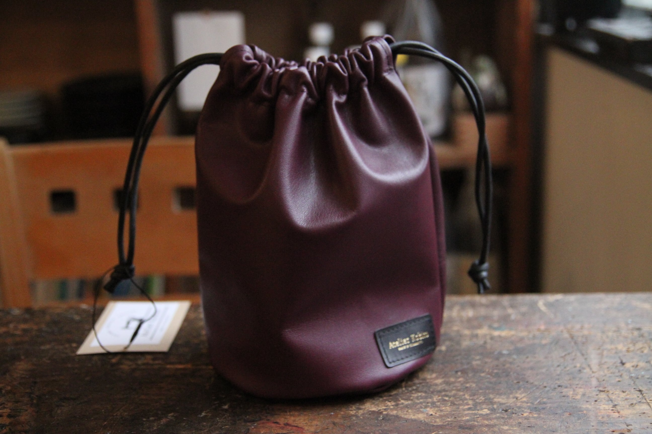 熊本は坪井にあるレザークラフトショップ『アトリエコビト』のDrawstring Bag。