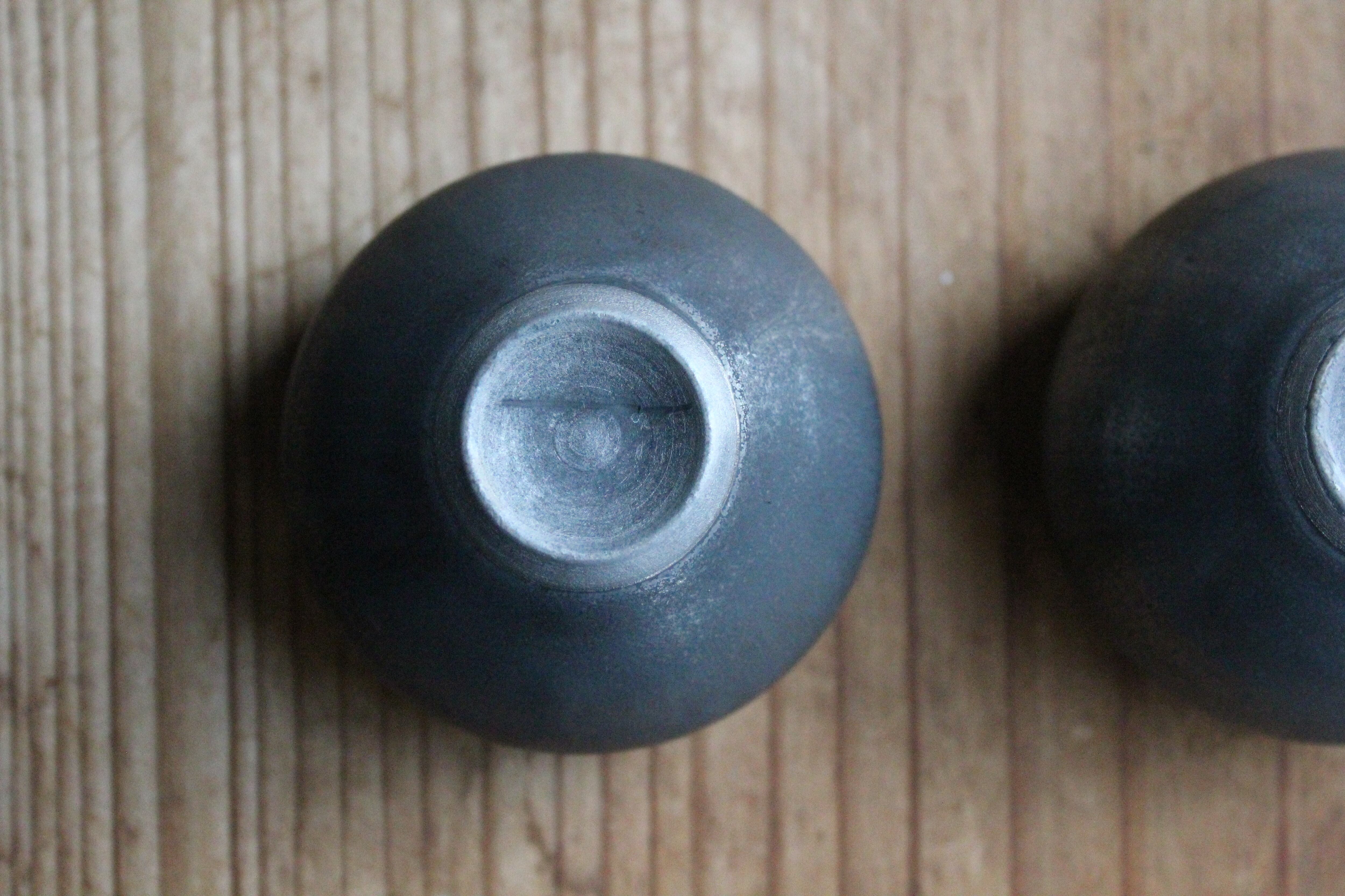 こちらはブラックシルバーなお猪口。なにしろそのカーヴはもはやエロチシズムを感じさせるほどしなやかに美しく、それは手に馴染むというよりかは、言ってみれば抱かれる(いだかれる)感じ。その磁肌をずっとすりすりさすっていたくなるのは、やはり日本が誇る天草陶石メイドの誇りでありましょうか。お尻のシルバーの細かい仕事ももちろんポイントです。