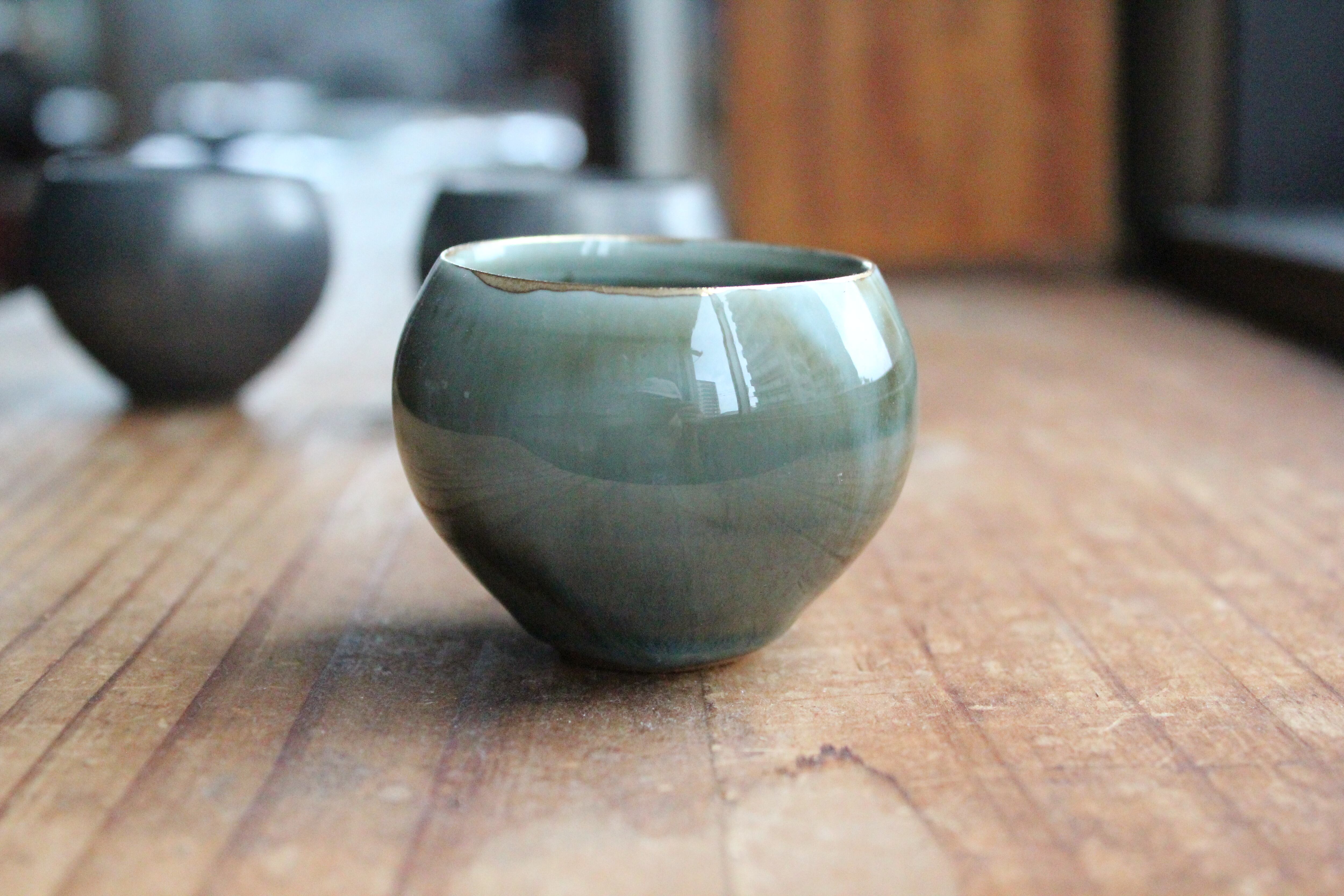 エメラルドがかった美しい歴史ある釉薬、その口にまるで紅をさすようにはみ出し滴る黄金の淵。「決してまだ完成はしたくはないんだ。完成する前にどこかに遠くへ飛びたいんだ」。勝手にそんなメッセージを受けながら、夭折したトランペッター、リー・モーガンのレコードに針を落とす休日。そんな休日にこそ、柔らかく手にとってほしい杯。