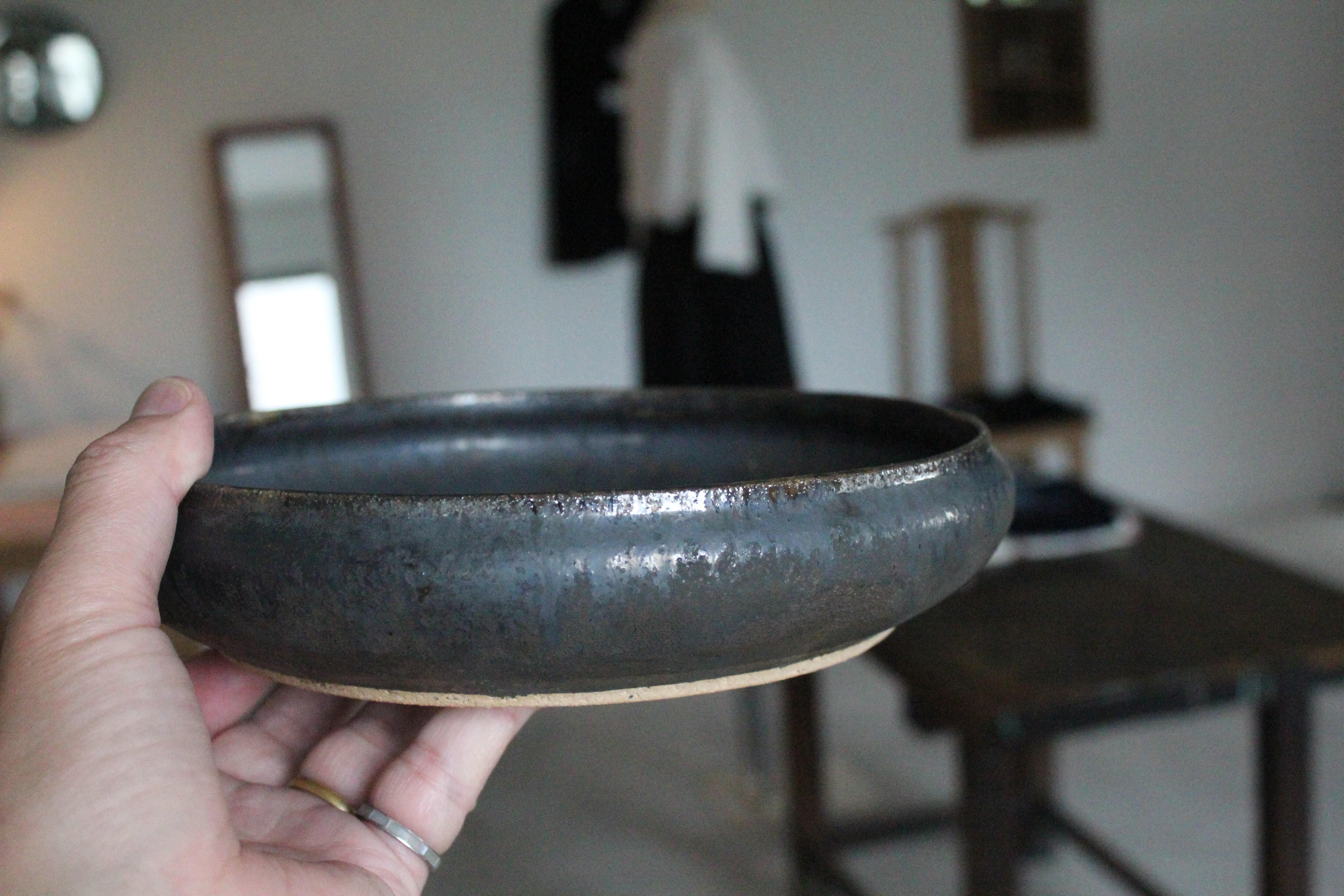 こちらは花田勇樹作の皿。使えば使うほど、青みがかった深い色合いになっていく、育てがいのある器です。グリーンカレーなど、原色が映える器です。