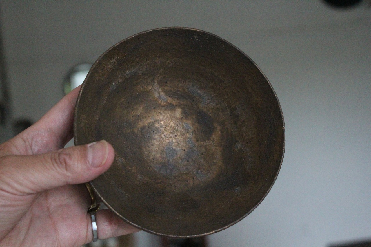 こちらは花田勇樹作の歪み椀。その名の通り、微妙絶妙に歪んだその椀こそ、手に取りやすいこと、この上ナッシング。取り鉢、ちょいと盛る鉢によろしく、ブロンズの光沢感がすこぶる輝く、どうしても欲しくなる一品ございます。