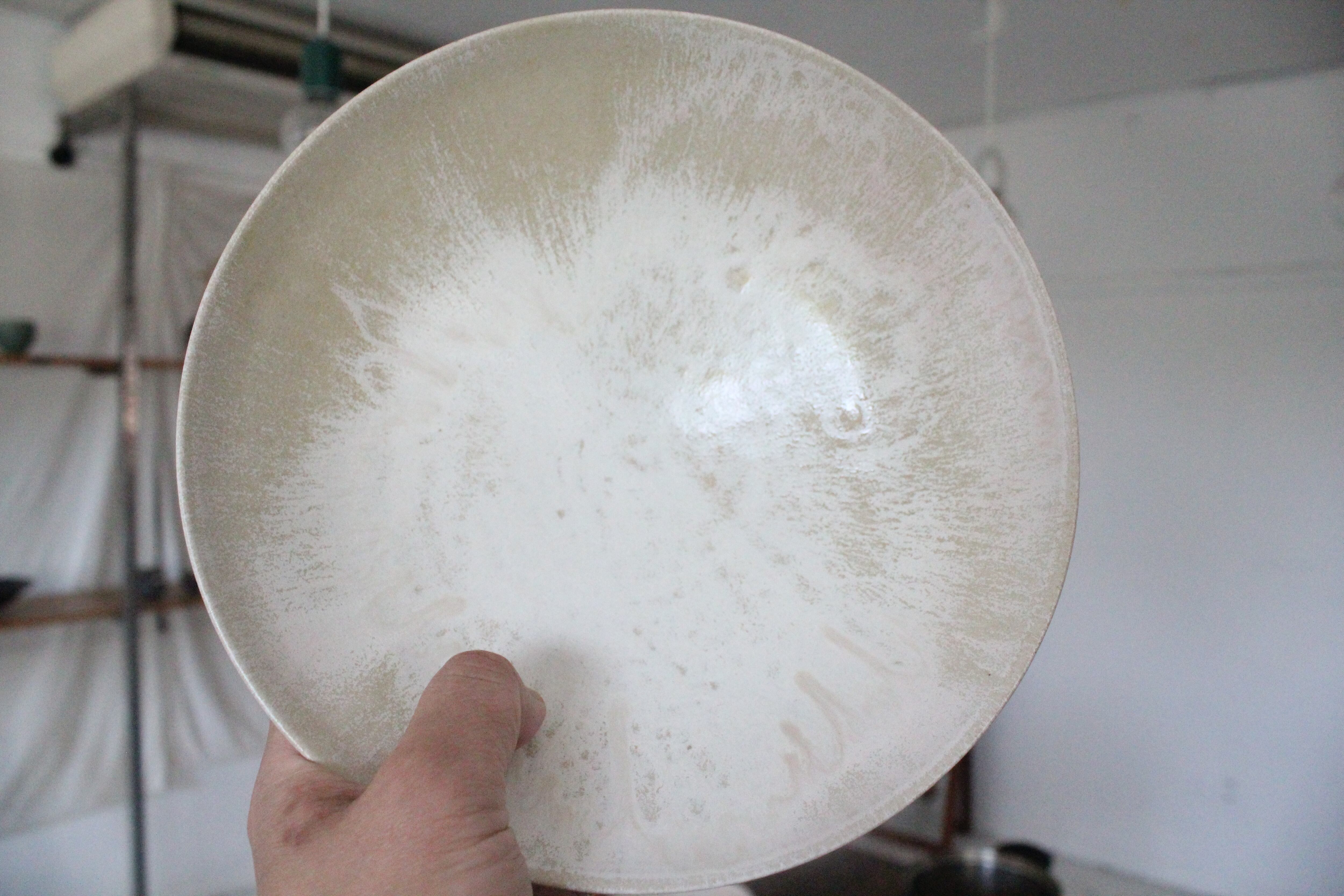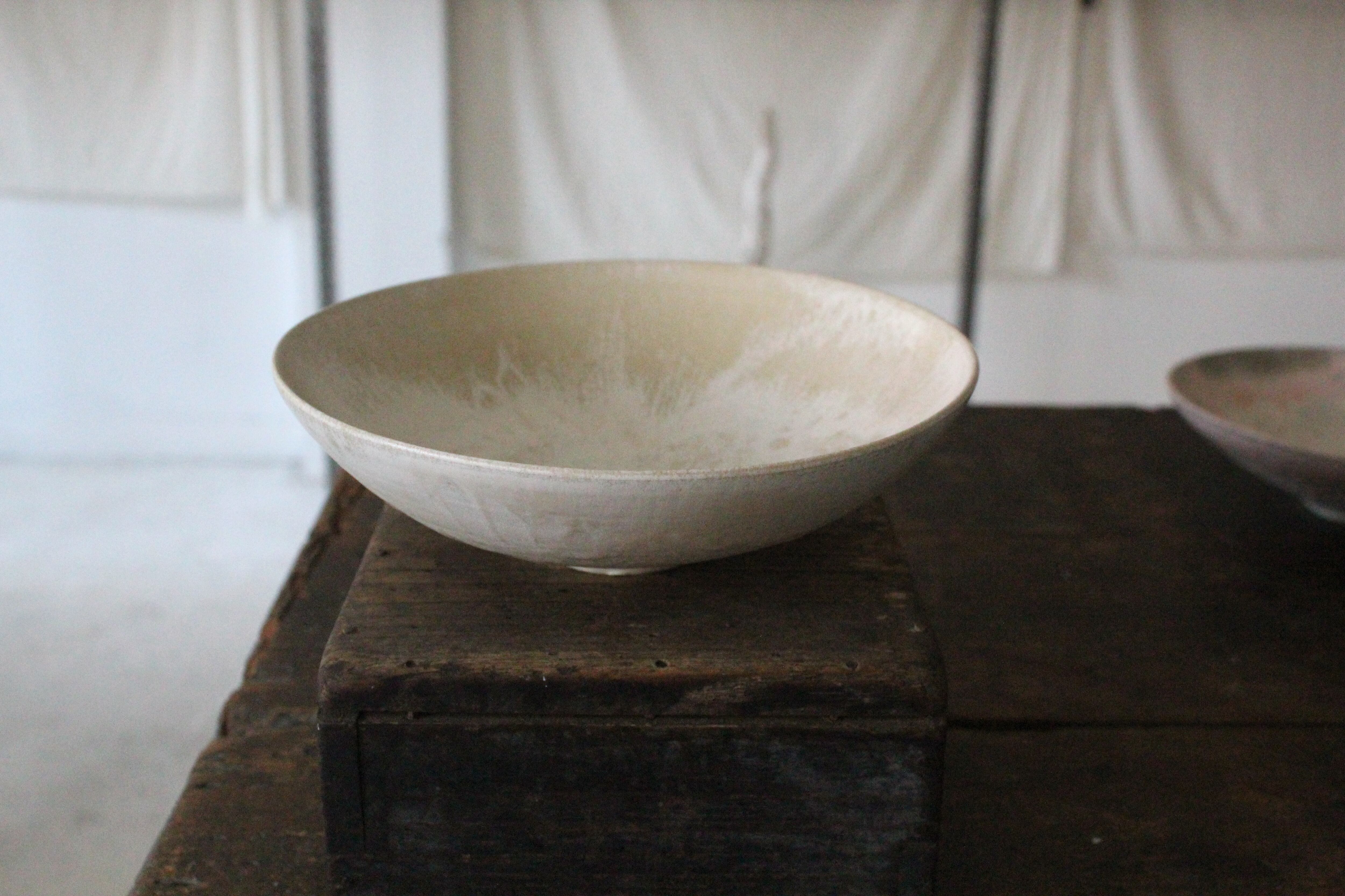 こちらは花田智枝子作によるボウル。どう考えても使いやすいそのフォルム、どう盛っても食欲をそそられるはずのそこはかとないピンク、忘れた頃に効いてくるちらほらなグリーン、料理を愛す人であればこそ、響く器、ここにあり。一点一点、色合いが違います。こちらは少しピンクが少なめでしょうか。