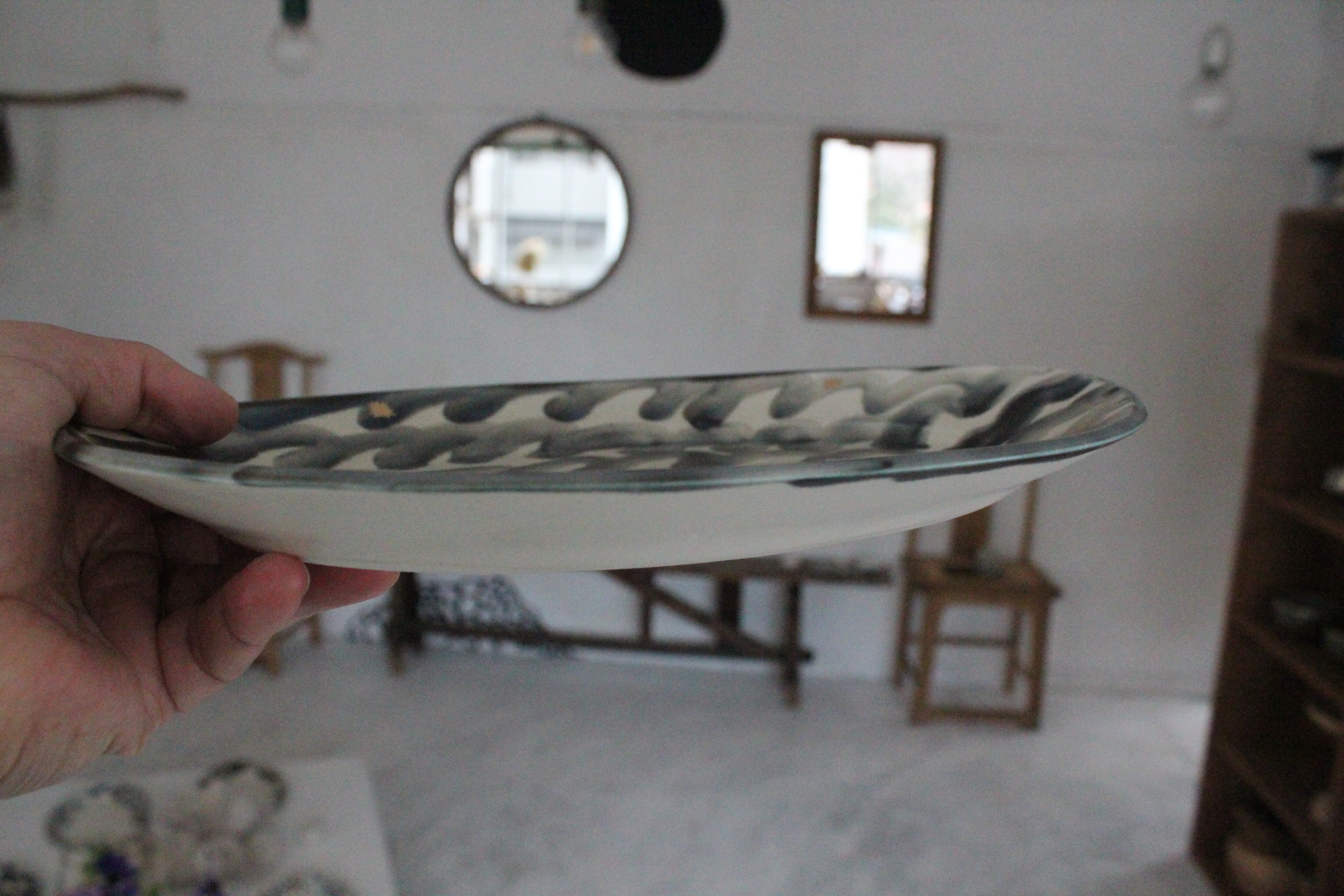 熊本は天草。木ユウコによるオーバルプレート。大きさも程よく使いやすく、朝食、カレーなどなど活躍間違いナッシン。磁器。遊び心ある金のワンポイントペインティング。28.7センチ×20センチ。