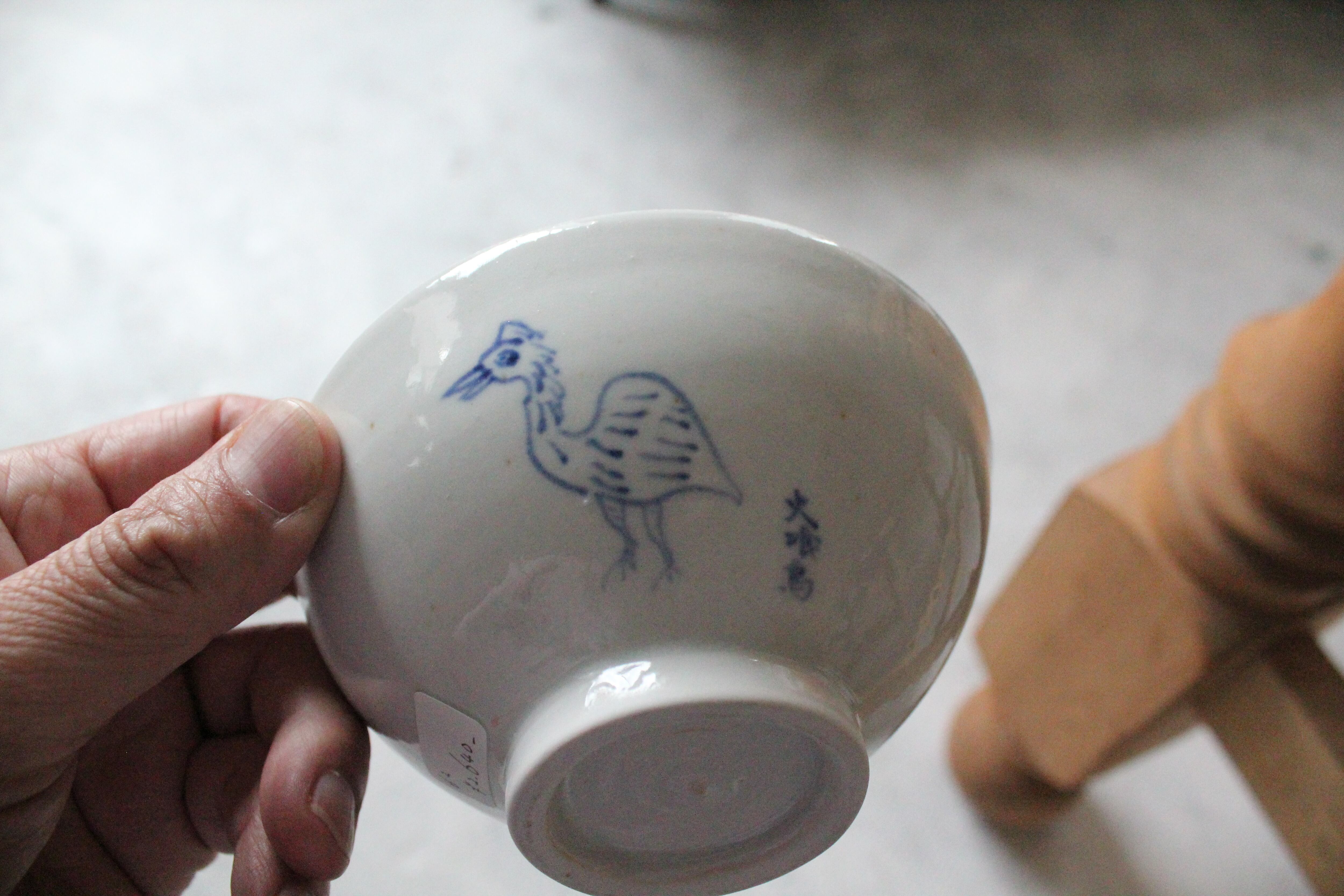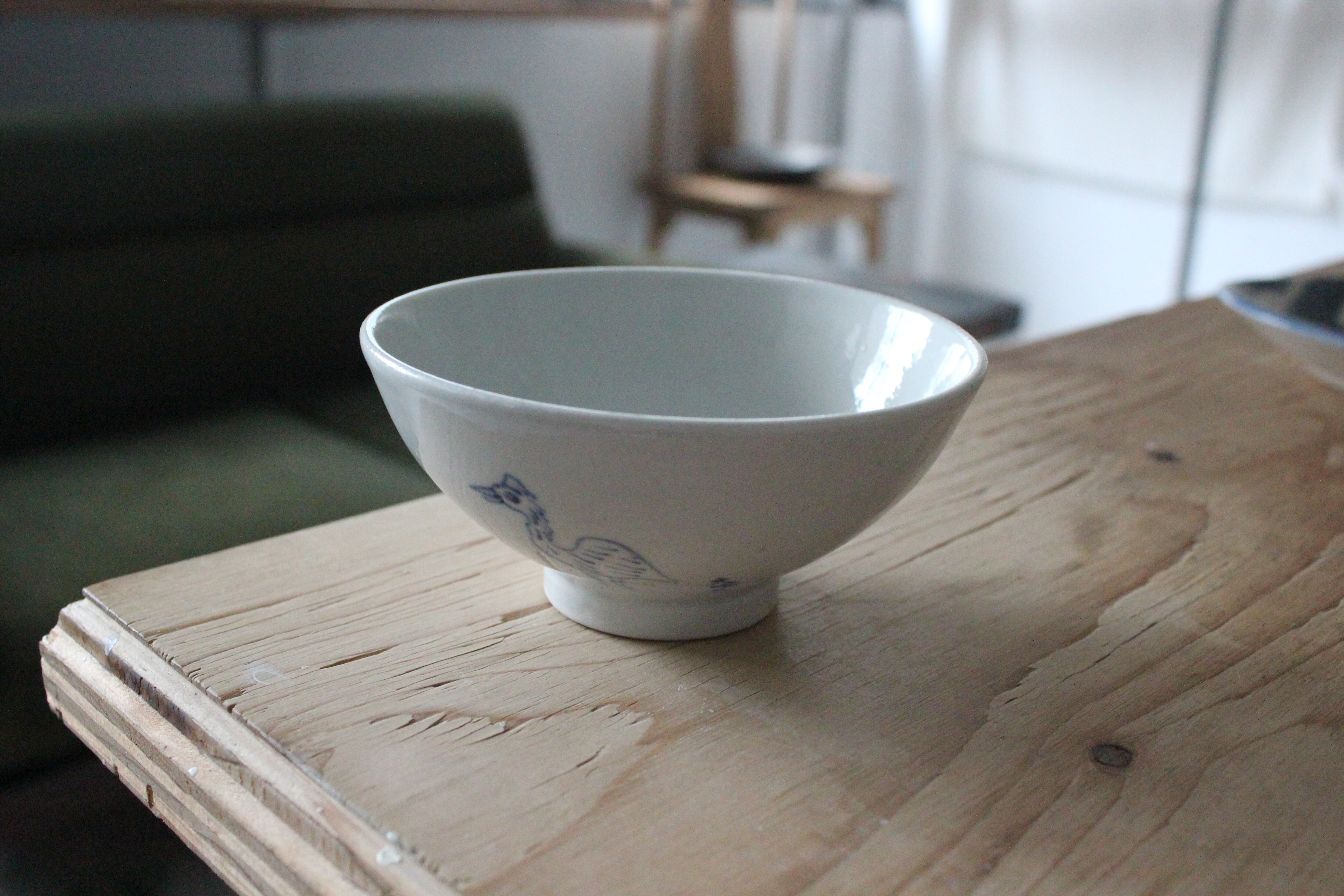 大分の陶芸家水垣千悦による磁器の飯碗。火喰鳥の絵付。