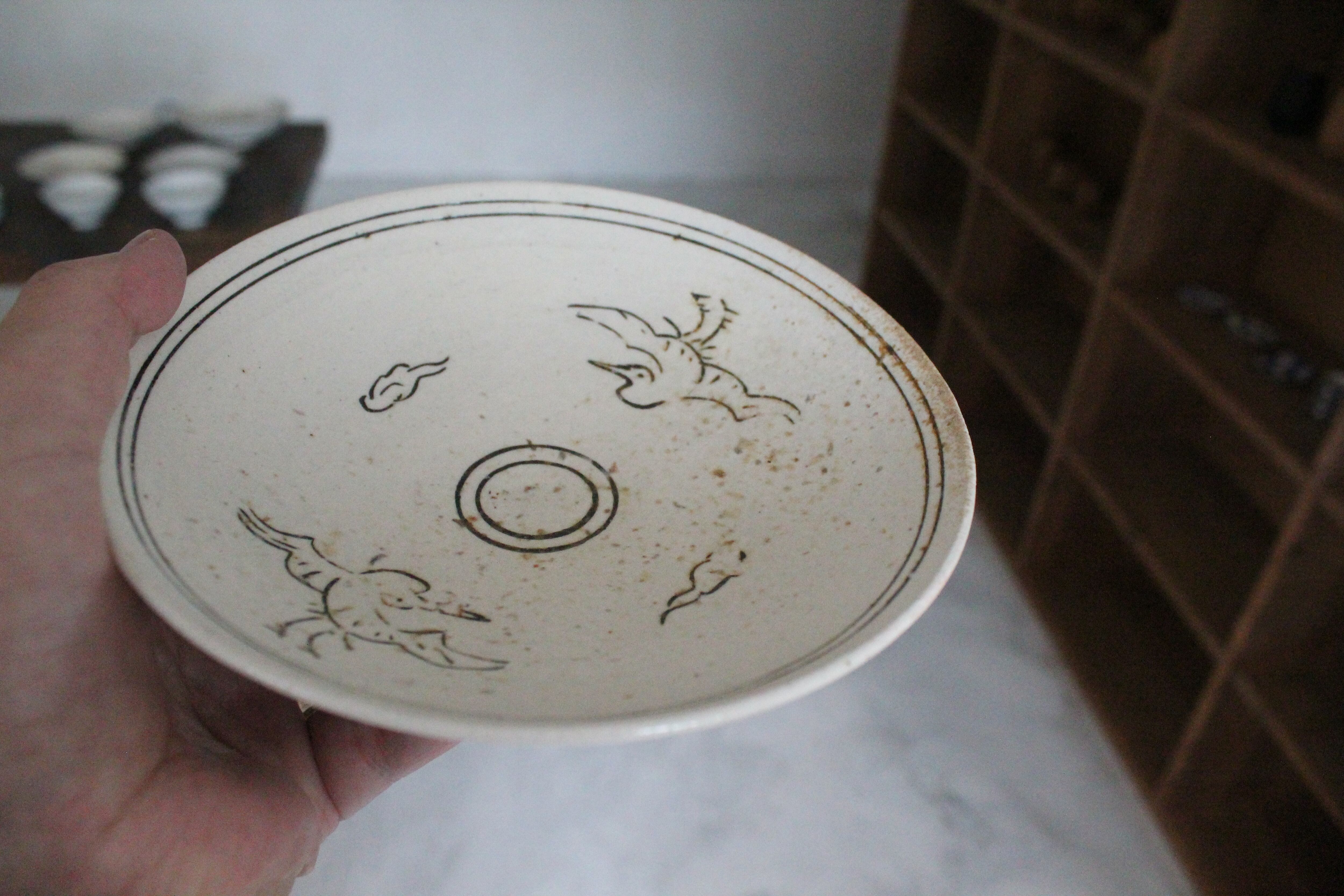 大分の陶芸家水垣千悦による黒象嵌中皿。こちらは薪窯による茶点のような自然の焼き模様が浮き出ています。ナチュラルな焼きシミのようなもの。僕かえってそういう自然な風合いは好きですが、気になる方はご注意くださいませ。